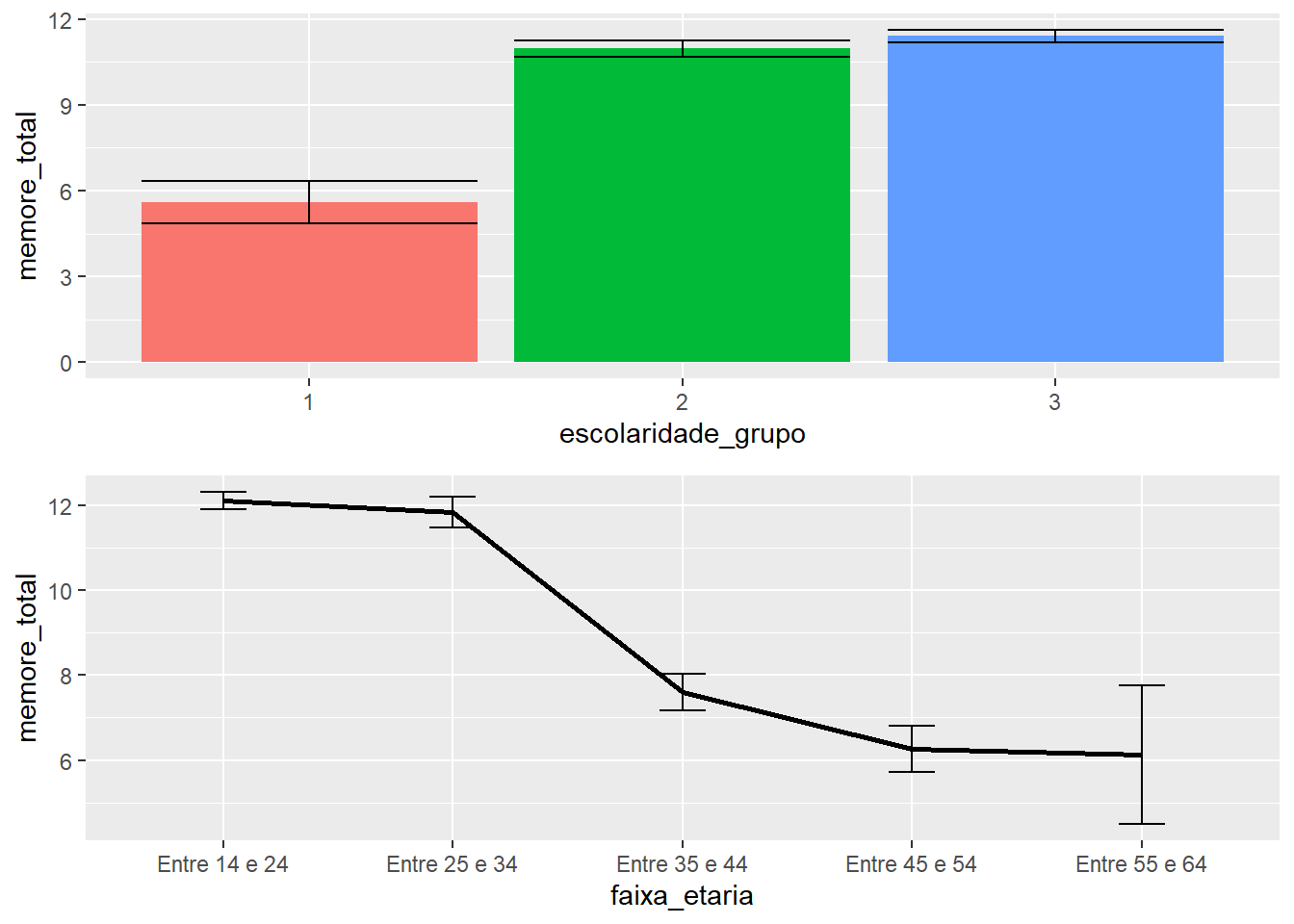 Ambos os resultados já permitem identificar algumas características gerais. Primeiro, quão maior a escolaridade, maior o valor obtido na escala. Segundo, algumas barras de erros estão superpostas e outras não, o que nos leva à conclusão preliminar de que resultados significativos estarão presentes na próxima etapa, que é a modelagem formal dessa hipótese.