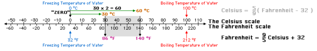 Apesar de haver a possibilidade de conversão de uma escala para outra, repare que não é possível utilizar a propriedade multiplicativa. Por exemplo, enquanto numericamente 30 x 2 = 60, afirmar que 30º C x 2 = 60º C é incorreto. Na verdade, 30º C se refere a 86º F e 60º C se refere a 140º F.