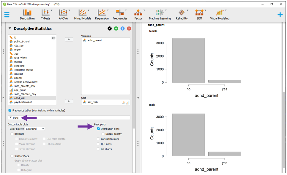 O gráfico de barras pode ser acessado clicando na opção Plots e, em seguida, Distribution plots, em Basic plots. Esse resultado é um recurso a mais para sondar os dados.