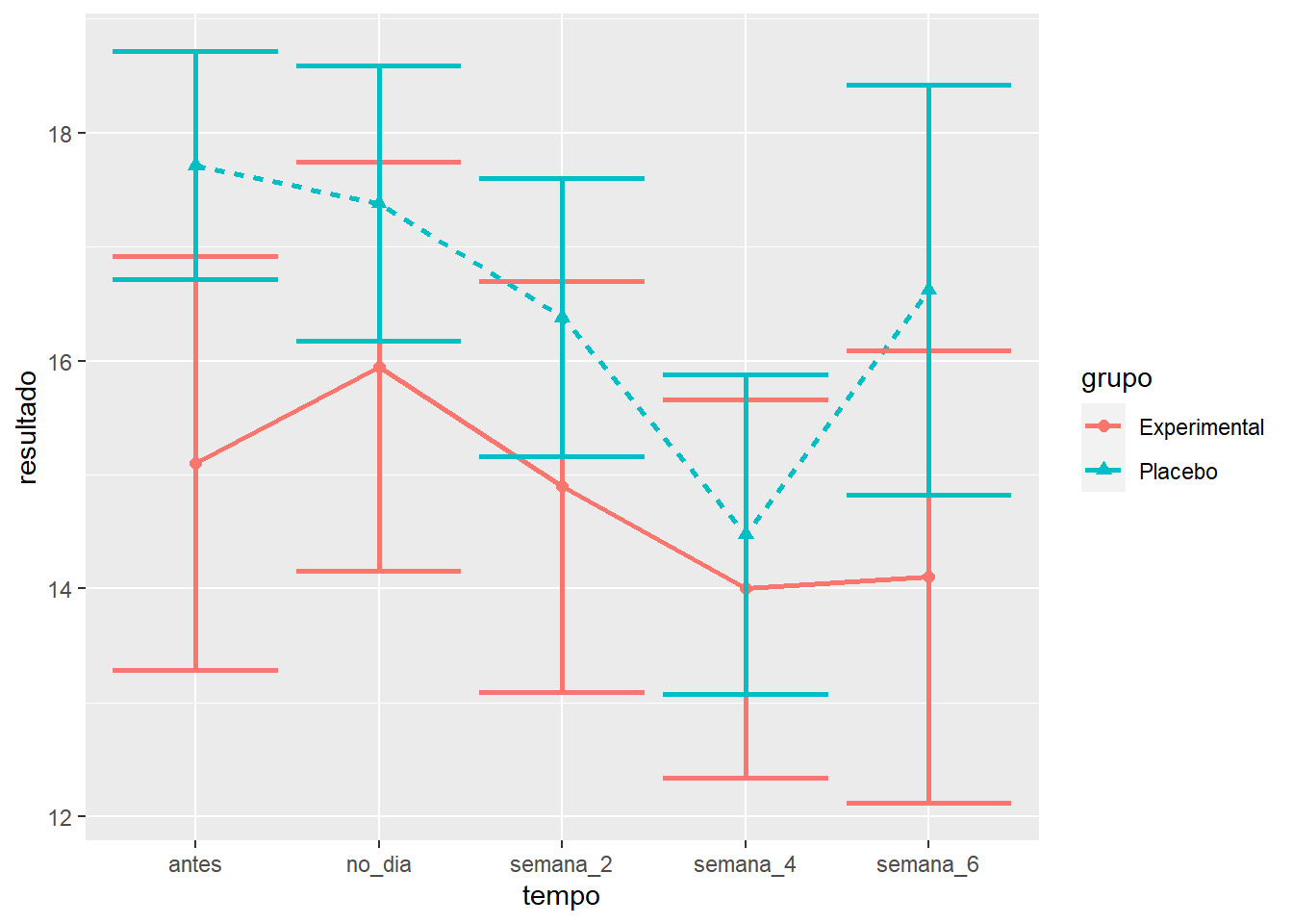 Os resultados já deixam a impressão de que ambos os grupos tiveram desfechos próximos durante toda a pesquisa. Entretanto, testes formais precisam ser feitos para se chegar a esta conclusão. O R oferece alguns pacotes específicos para modelos mistos. Os pacotes lme4 e lmerTest serão utilizados aqui.