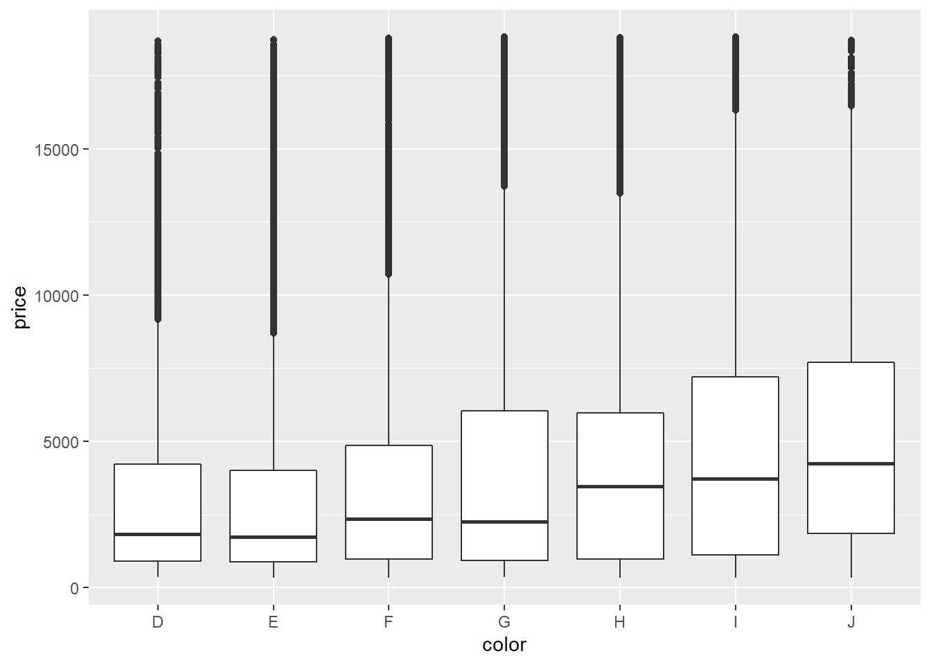 ggplot(diamonds, aes(color, price)) + geom_boxplot()