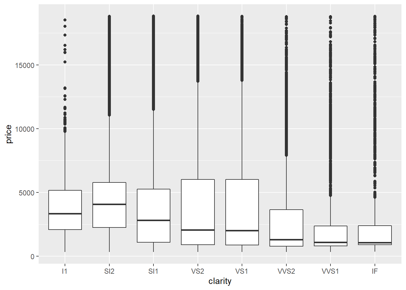 ggplot(diamonds, aes(clarity, price)) + geom_boxplot()