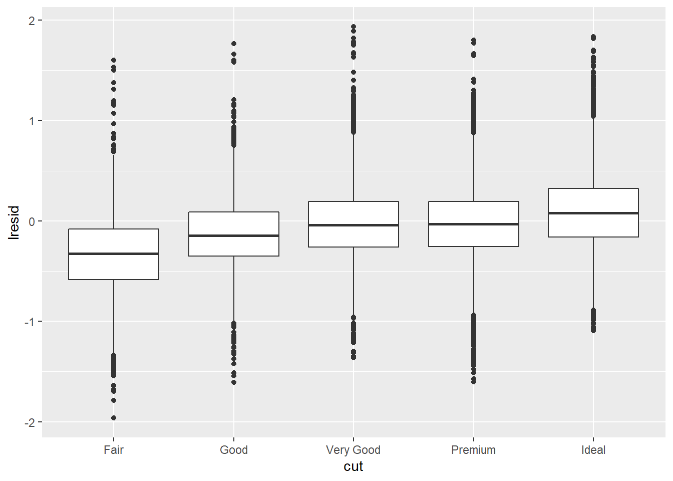 ggplot(diamonds2, aes(cut, lresid)) + geom_boxplot()