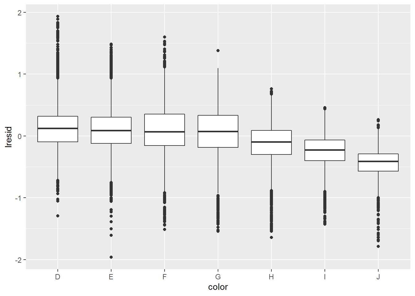 ggplot(diamonds2, aes(color, lresid)) + geom_boxplot()