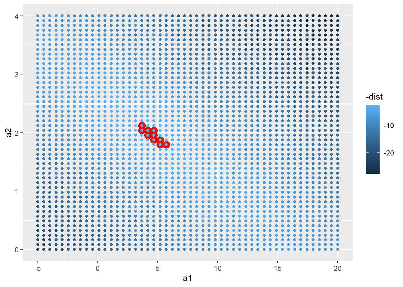 geom_point(data = filter(grid, rank(dist) <= 10), aes(x = a1, y = a2), size = 4, col = "red")+
