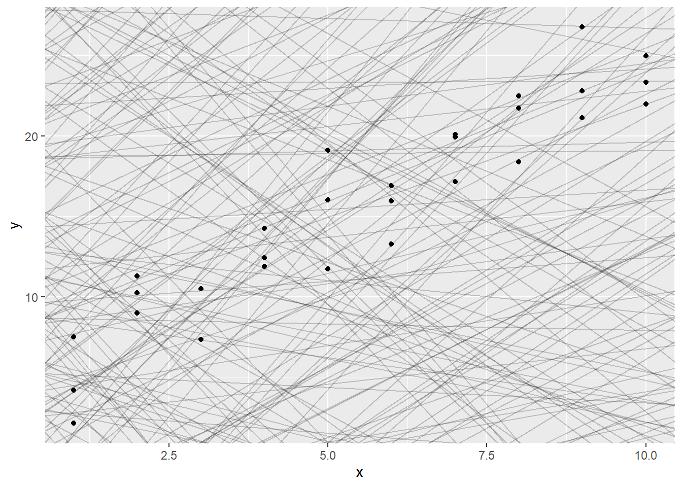 geom_abline(data = models, aes(intercept = a1, slope = a2), alpha = 0.2)