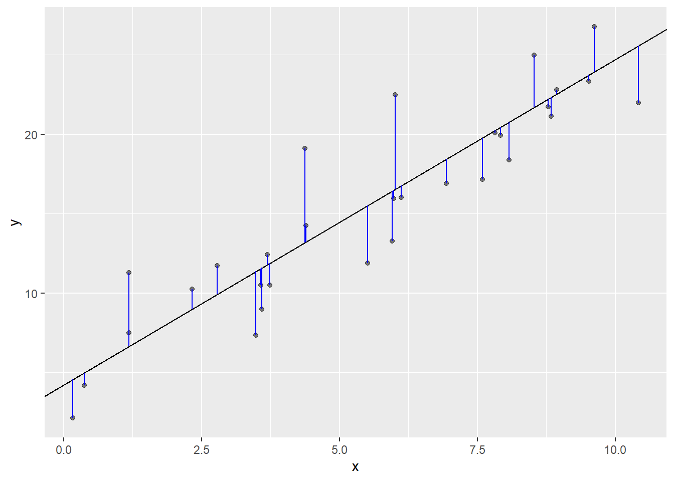 distance <- tibble(x = sim1$x, y = sim1$y, xend = x, yend = 4.22 + 2.05 * x )