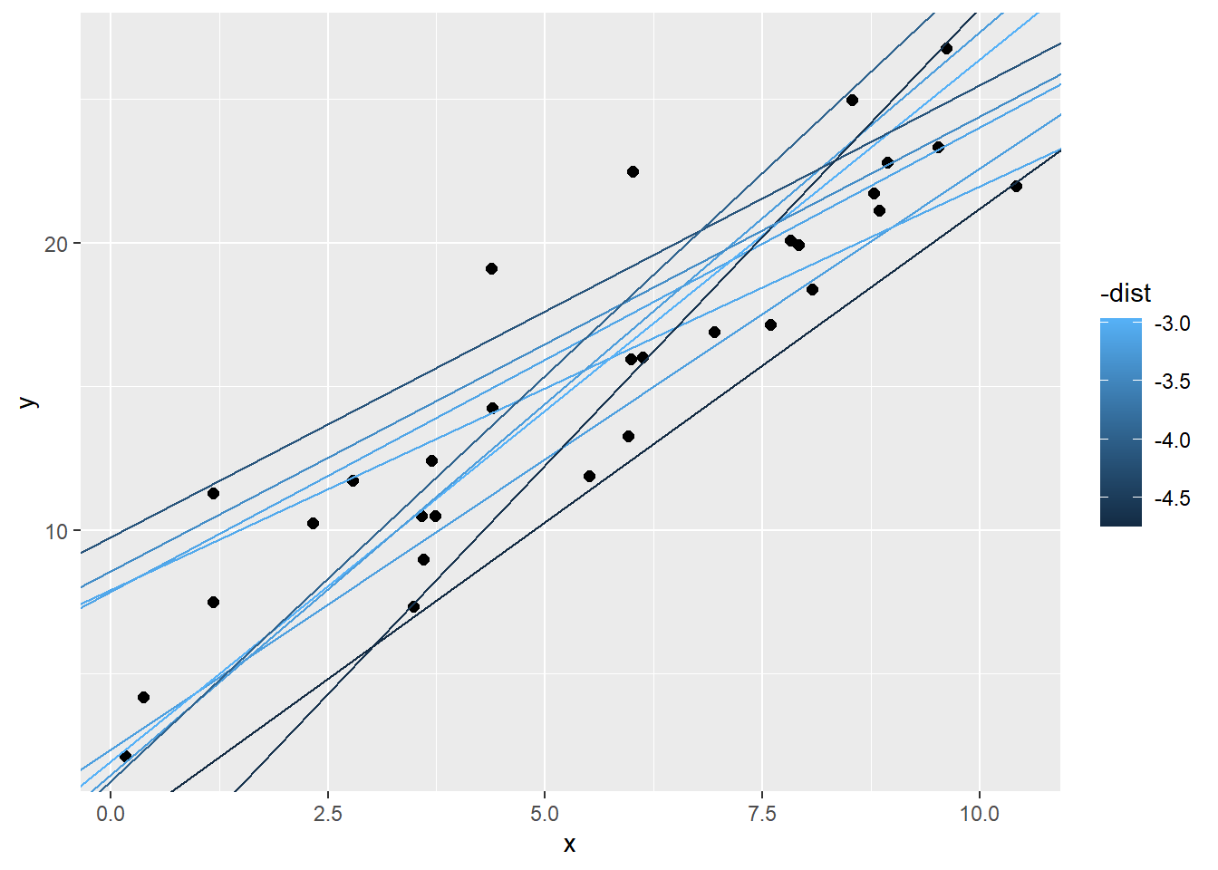 geom_abline(data = filter(grid, rank(dist) <= 10), aes(intercept = a1, slope = a2, col = - dist))