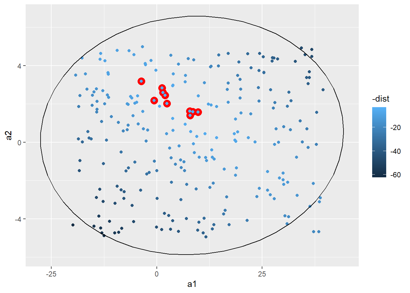 models %>% ggplot(aes(x = a1, y = a2, col = - dist)) +