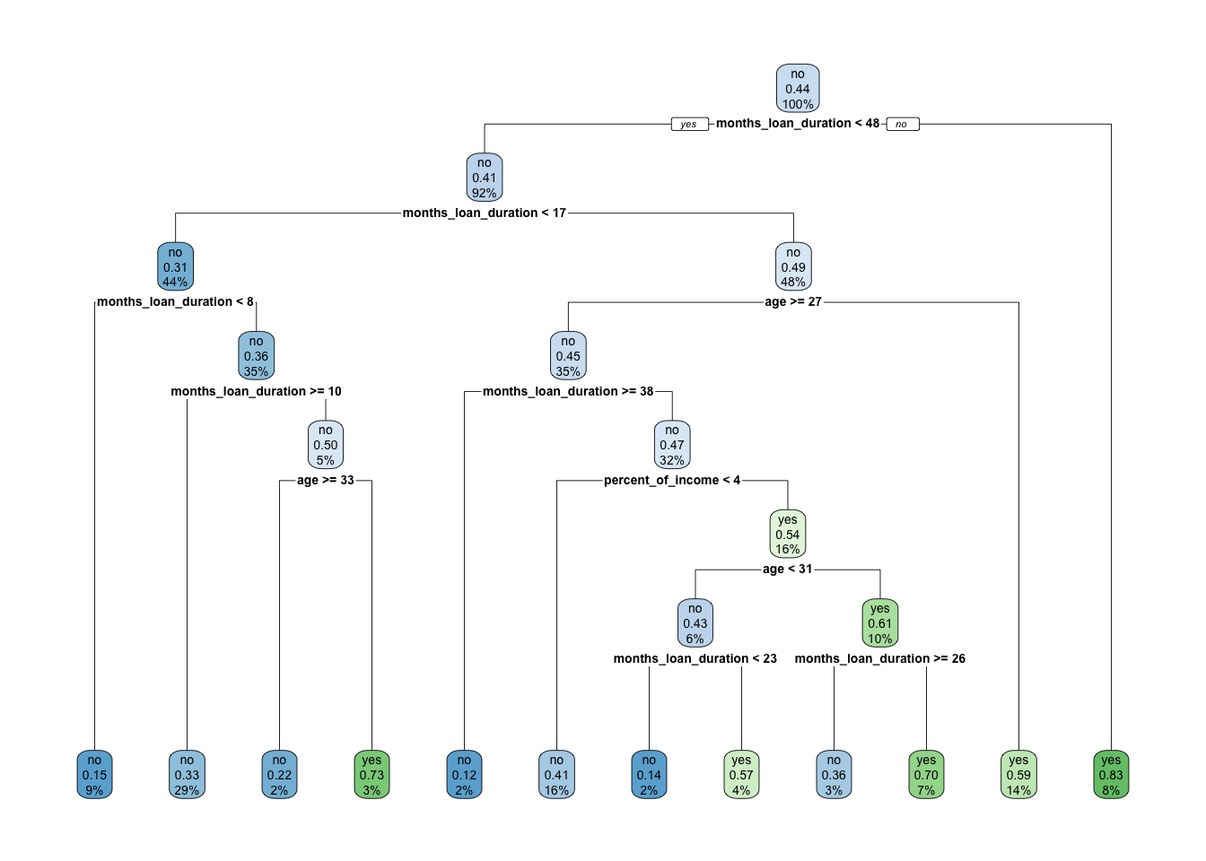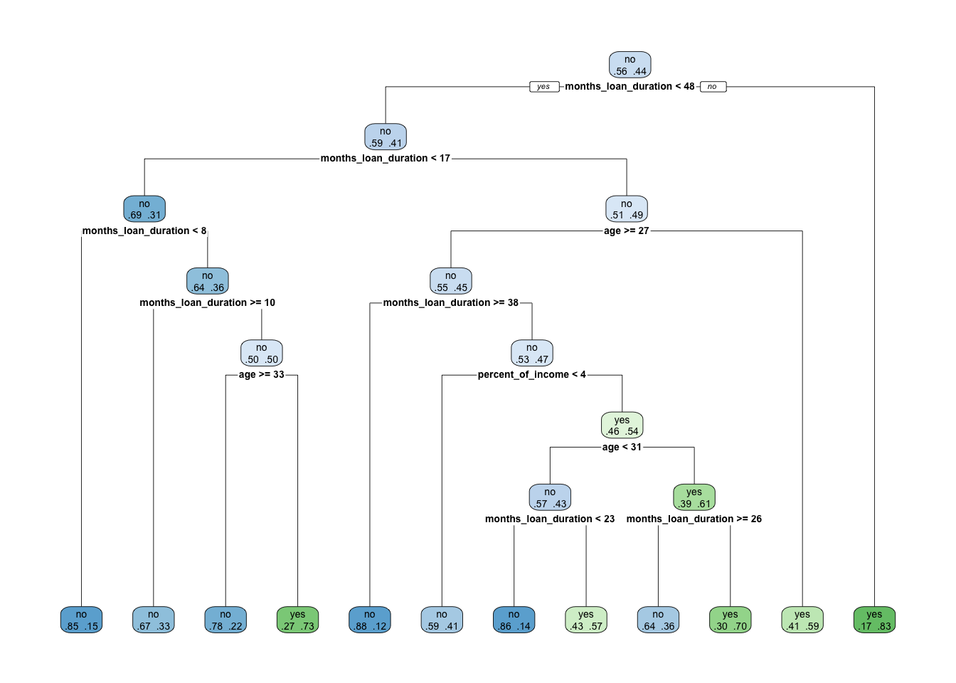 ## 5) months_loan_duration>=17 177 87 no (0.5084746 0.4915254)