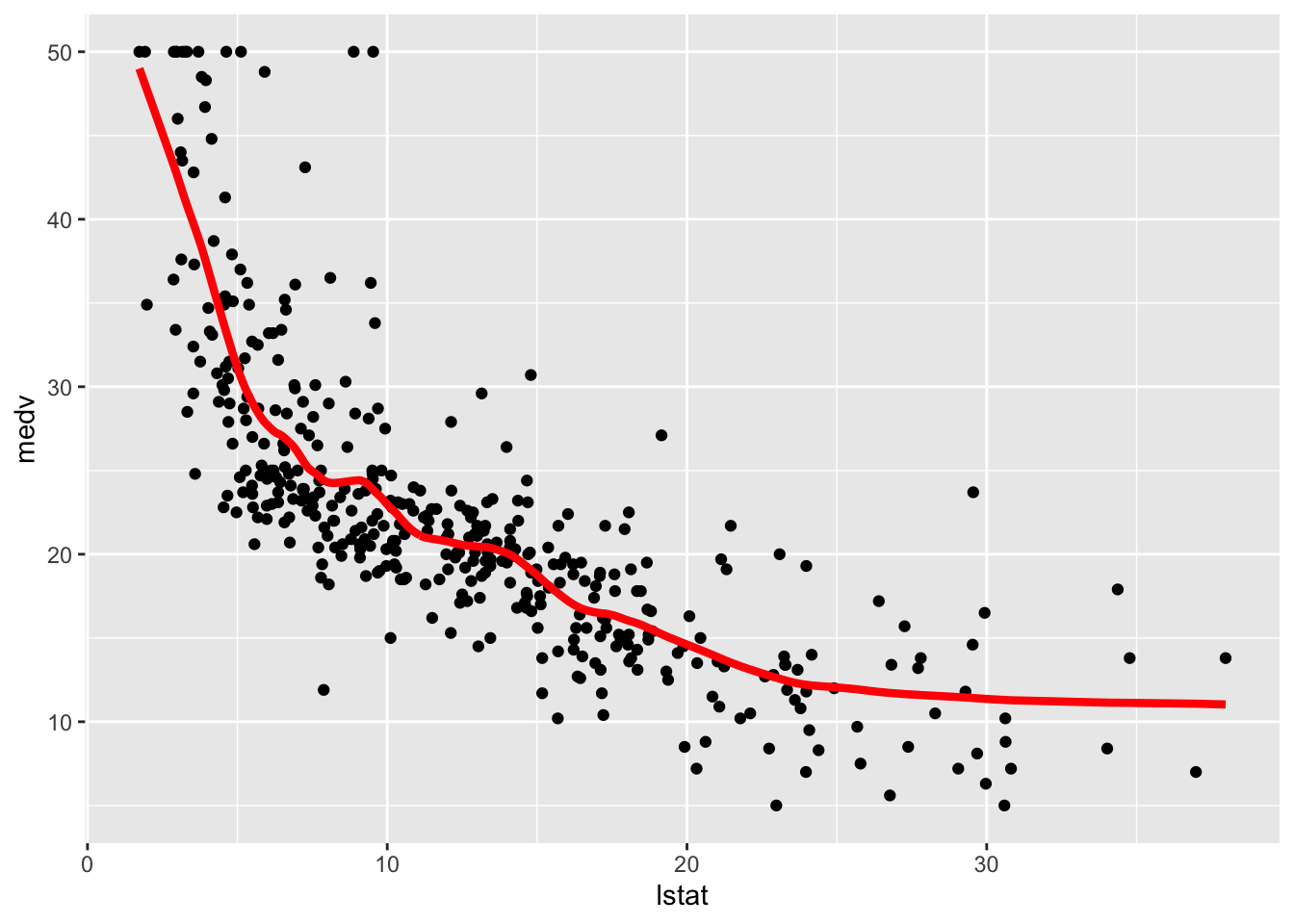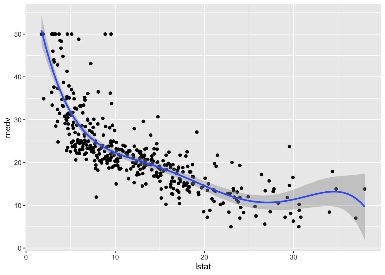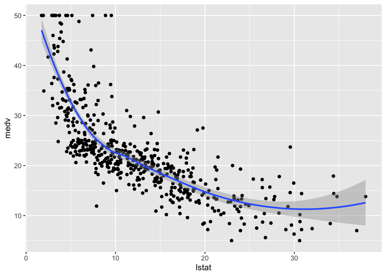 We consider lstat (lower status of the population (percent)) as the only regressor/covariate and medv (median value of owner-occupied homes in $1000s) as response variable. The relationship between the two variables is shown in the following scatterplot: