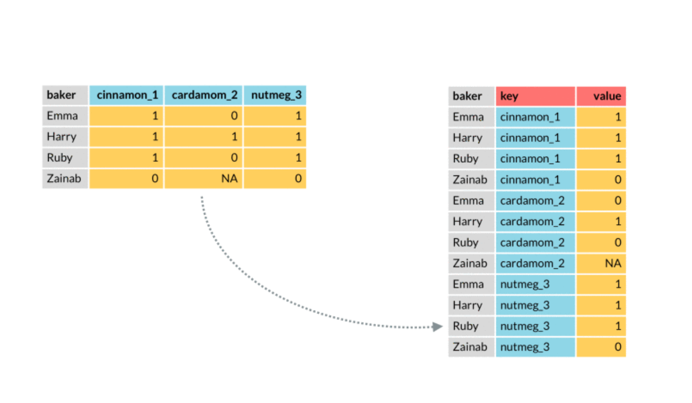 The observations (baker in the picture) correspond to our statistical units for which we have several predictions coming from different models. On the left (wide format) we have a column for each prediction method. On the right (long format) the observations are repeated for several lines and we have two new columns: one for the key (method in our case) and the value (the predictions in our case).