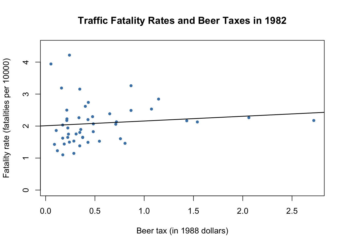 main = "Traffic Fatality Rates and Beer Taxes in 1982",
