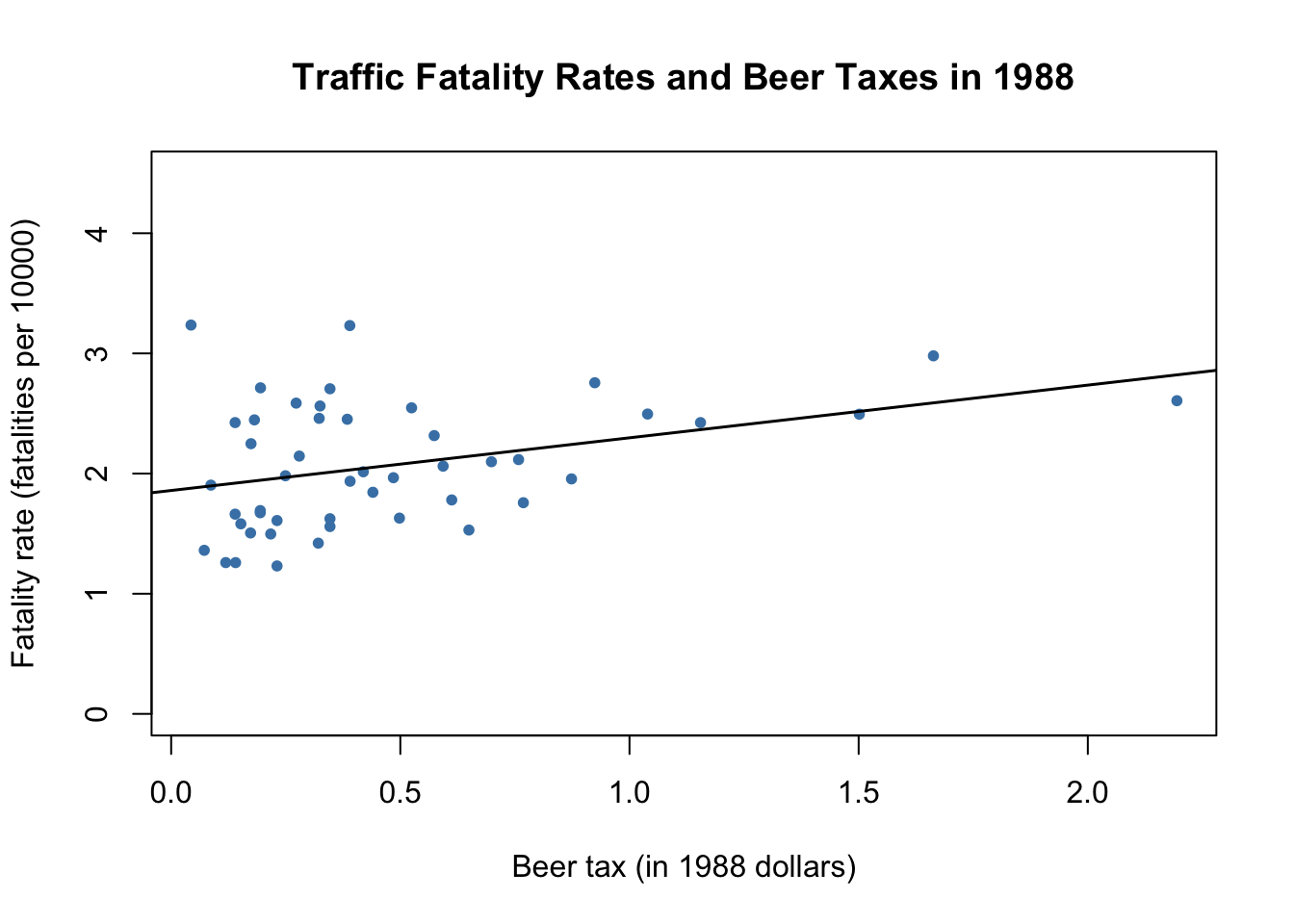 \widehat{FatalityRate} =& \, \underset{(0.11)}{1.86} + \underset{(0.13)}{0.44} \times BeerTax \quad (1988 \text{ data}).