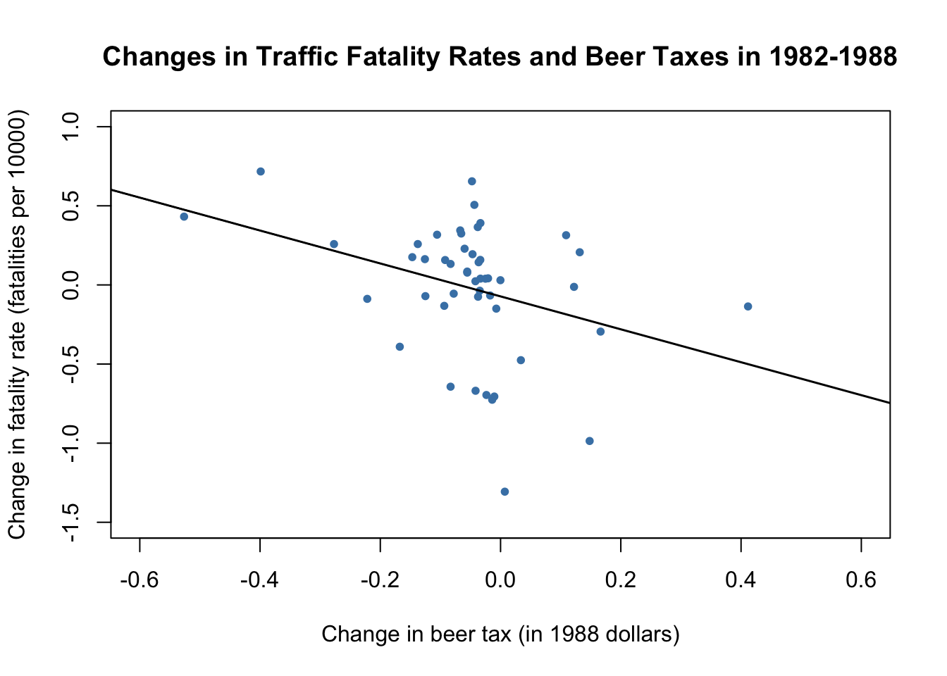 Suppose there are only \(T=2\) time periods \(t=1982,1988\). This allows us to analyze differences in changes of the the fatality rate from year 1982 to 1988. We start by considering the population regression model \[FatalityRate_{it} = \beta_0 + \beta_1 BeerTax_{it} + \beta_2 Z_{i} + u_{it}\] where the \(Z_i\) are state specific characteristics that differ between states but are constant over time. For \(t=1982\) and \(t=1988\) we have \[\begin{align*} FatalityRate_{i1982} =&\, \beta_0 + \beta_1 BeerTax_{i1982} + \beta_2 Z_i + u_{i1982}, \\ FatalityRate_{i1988} =&\, \beta_0 + \beta_1 BeerTax_{i1988} + \beta_2 Z_i + u_{i1988}. \end{align*}\]We can eliminate the \(Z_i\) by regressing the difference in the fatality rate between 1988 and 1982 on the difference in beer tax between those years: \[FatalityRate_{i1988} - FatalityRate_{i1982} = \beta_1 (BeerTax_{i1988} - BeerTax_{i1982}) + u_{i1988} - u_{i1982}\] This regression model yields an estimate for \(\beta_1\) robust a possible bias due to omission of the \(Z_i\), since these influences are eliminated from the model. Next we use use R to estimate a regression based on the differenced data and plot the estimated regression function.