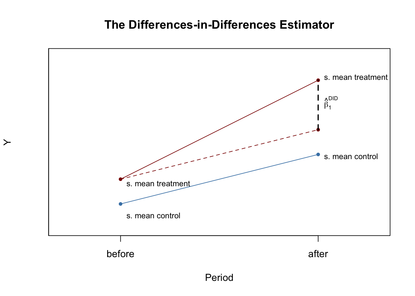 \[\begin{align} \widehat{\beta}_1^{\text{diffs-in-diffs}} =& \, (\overline{Y}^{\text{treatment,after}} - \overline{Y}^{\text{treatment,before}}) - (\overline{Y}^{\text{control,after}} - \overline{Y}^{\text{control,before}}) \\ =& \Delta \overline{Y}^{\text{treatment}} - \Delta \overline{Y}^{\text{control}} \tag{13.8} \end{align}\]with