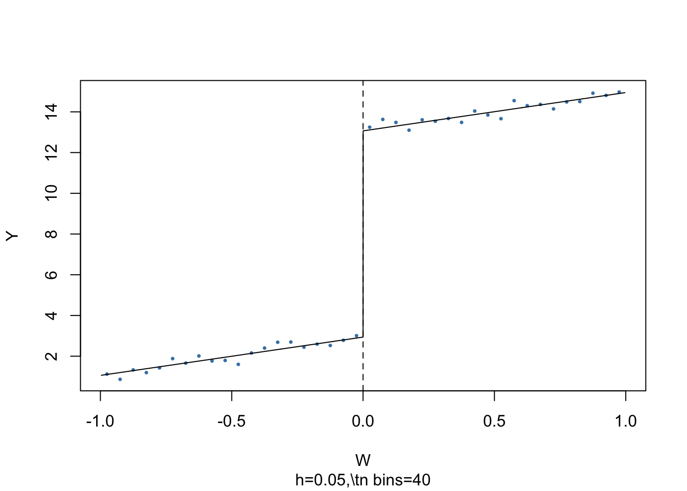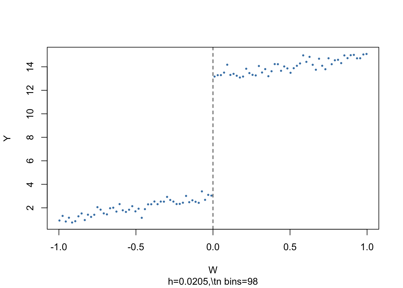 The subsequent code chunks show how to estimate a linear SRDD using R and how to produce plots in the way of Figure 13.2 of the book.