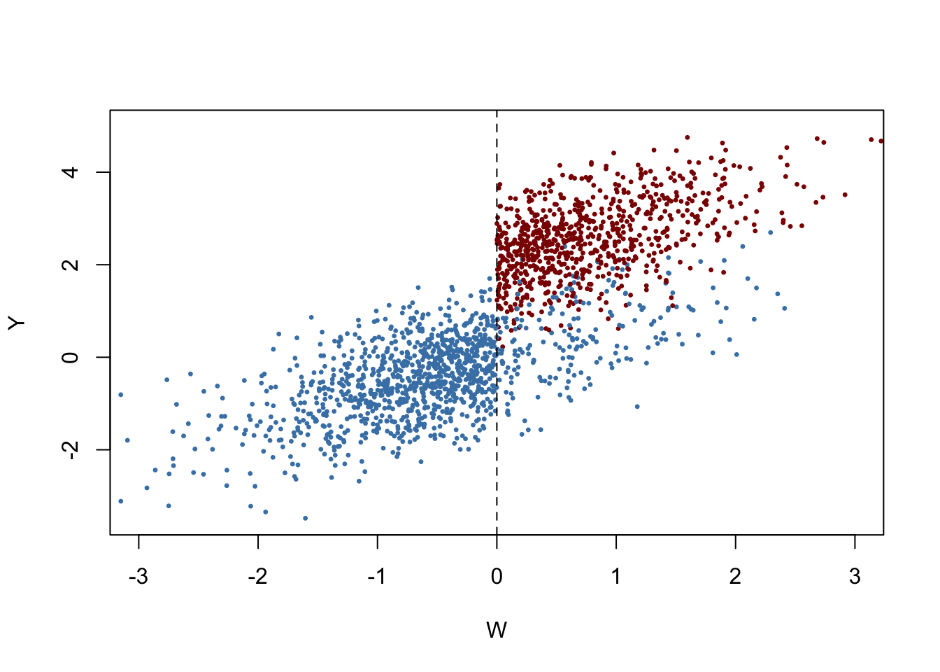 y <- 3 + 2 * W + 10 * (W>=0) + rnorm(1000)# load the package 'rddtools'
