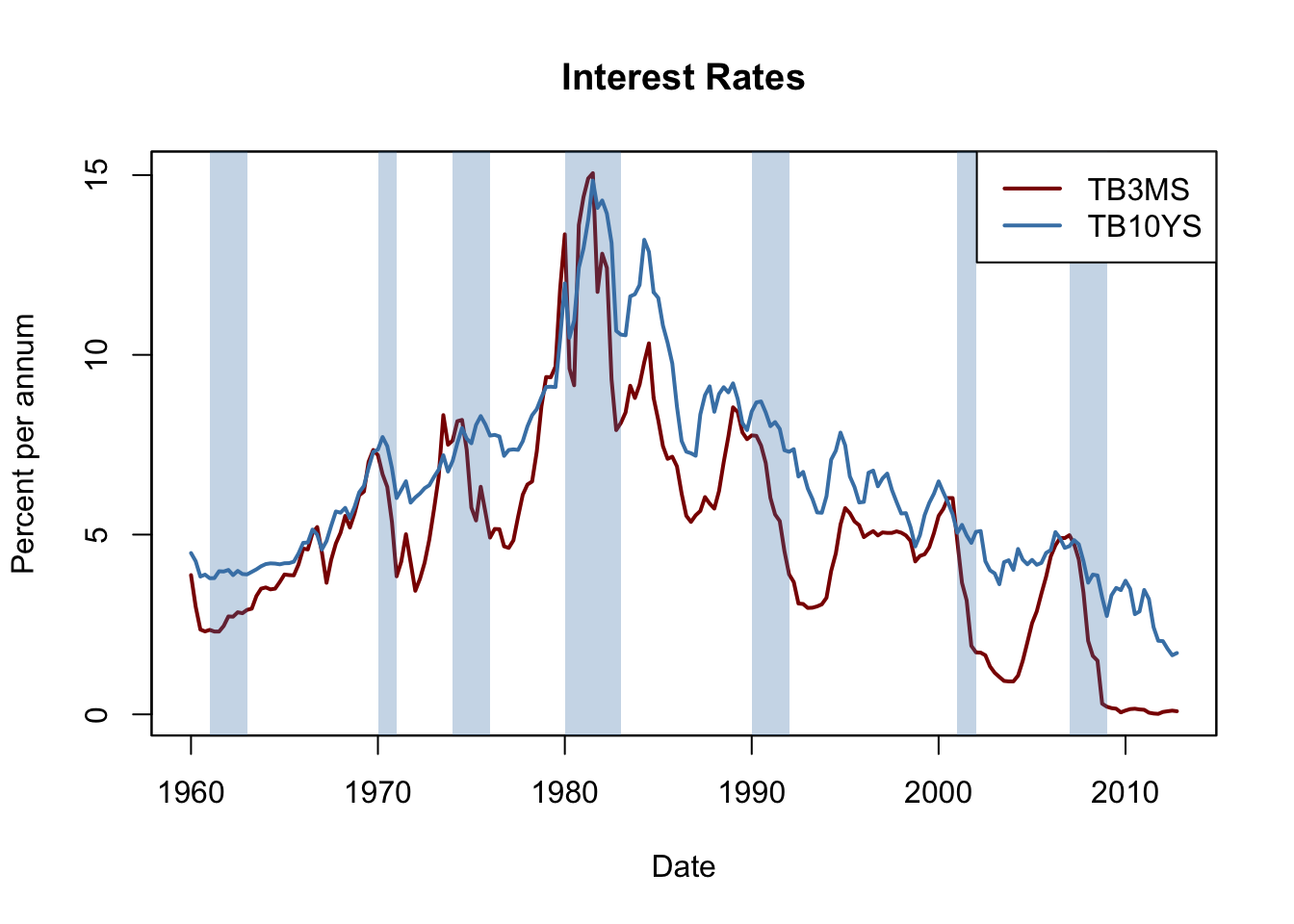 The following code chunks reproduce Figure 14.3 of the book which displays interest rates of 10-year U.S. Treasury bonds and 3-months U.S. Treasury bills from 1960 to 2012.