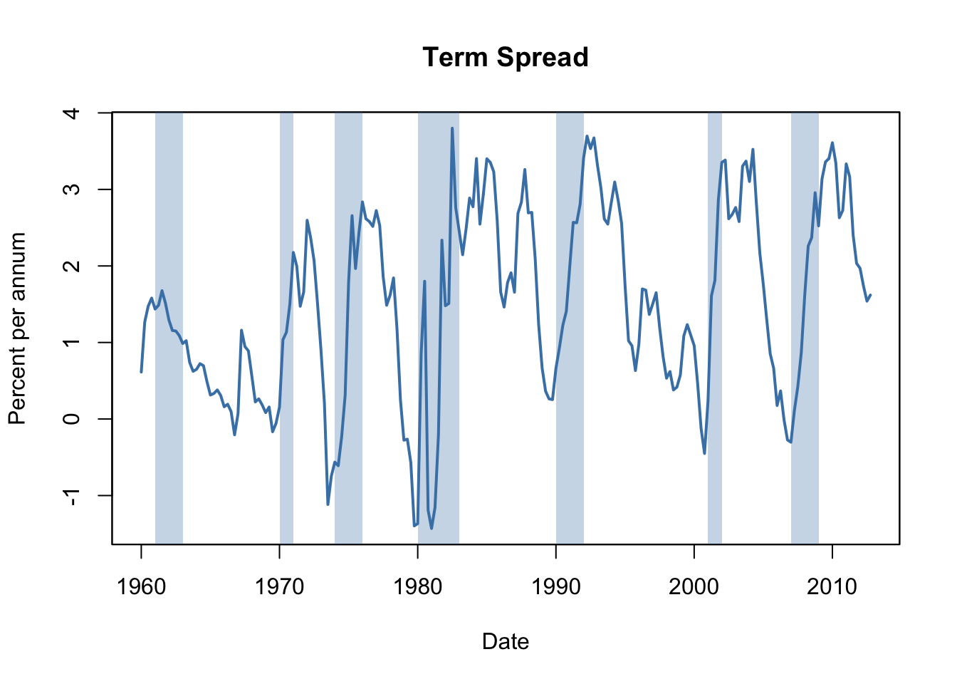 TSpread <- TB10YS - TB3MS# reproduce Figure 14.2 (a) of the book