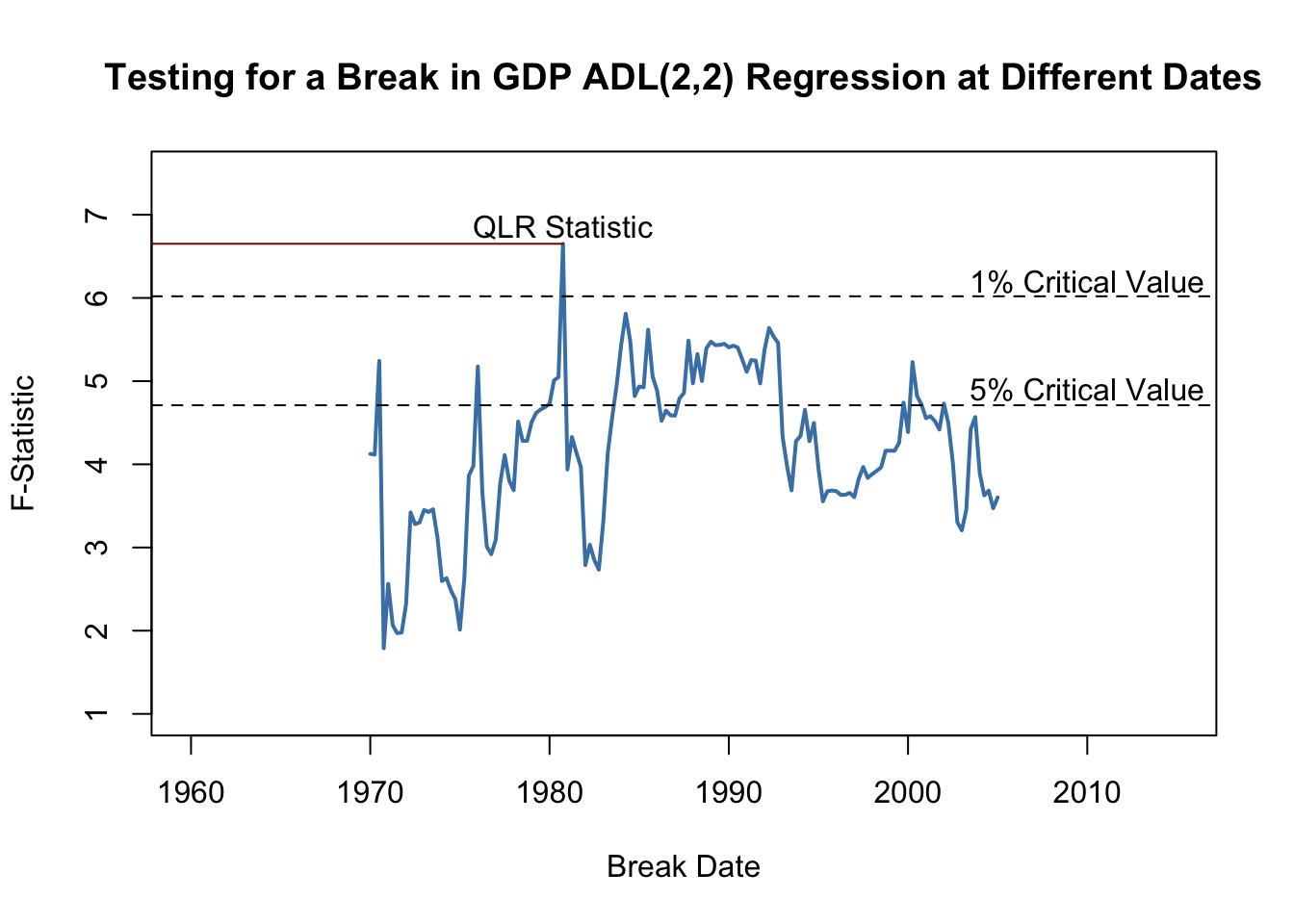 Since \(q=3\) hypotheses are tested and the central \(70\%\) of the sample are considered to contain breaks, the corresponding \(1\%\) critical value of the \(QLR\) test is \(6.02\). We reject the null hypothesis that all coefficients (the coefficients on both lags of term spread and the intercept) are stable since the computed \(QLR\)-statistic exceeds this threshold. Thus evidence from the \(QLR\) test suggests that there is a break in the ADL(\(2\),\(2\)) model of GDP growth in the early 1980s.