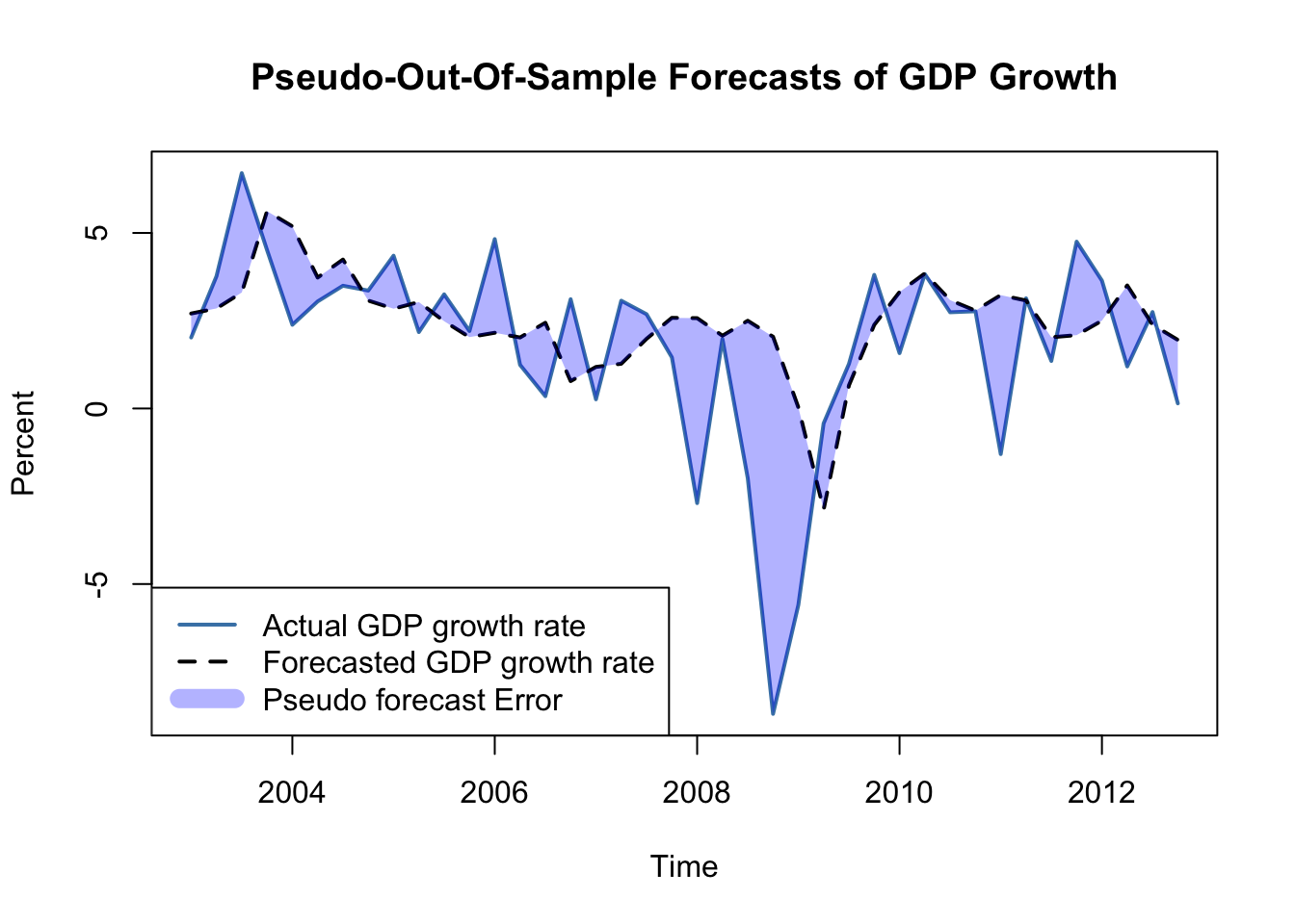 Apparently, the pseudo forecasts track the actual GDP growth rate quite well, except for the kink in 2009 which can be attributed to the recent financial crisis.