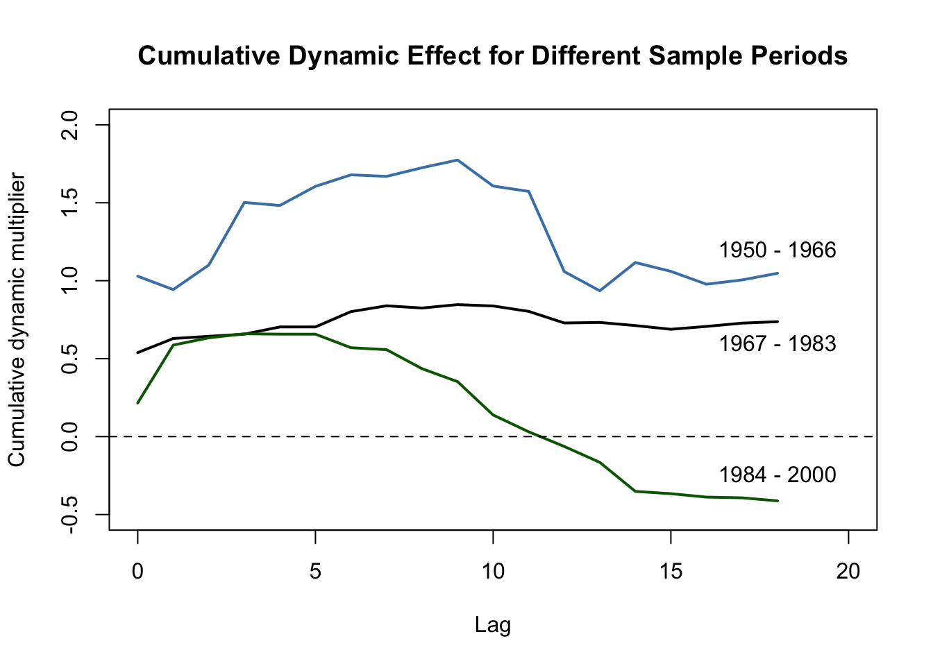 Clearly, the cumulative dynamic multipliers have changed considerably over time. The effect of a freeze was stronger and more persistent in the 1950s and 1960s. For the 1970s the magnitude of the effect was lower but still highly persistent. We observe an even lower magnitude for the final third of the sample span (1984 - 2000) where the long-run effect is much less persistent and essentially zero after a year.