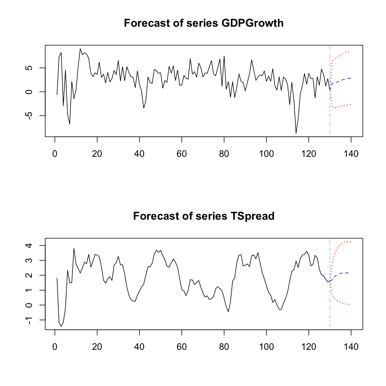 \[\begin{align*} GDPGR_t =& \, \beta_{10} + \beta_{11} GDPGR_{t-2} + \beta_{12} GDPGR_{t-3} + \gamma_{11} TSpread_{t-2} + \gamma_{12} TSpread_{t-3} + u_{1t}, \\ TSpread_t =& \, \beta_{20} + \beta_{21} GDPGR_{t-2} + \beta_{22} GDPGR_{t-3} + \gamma_{21} TSpread_{t-2} + \gamma_{22} TSpread_{t-3} + u_{2t} \end{align*}\]and then substitute the values of \(GDPGR_{2012:Q4}\), \(GDPGR_{2012:Q3}\), \(TSpread_{2012:Q4}\) and \(TSpread_{2012:Q3}\) into both equations. This is easily done manually.