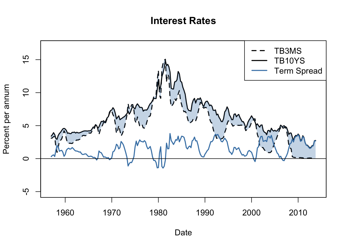 As an example, reconsider the the relation between short- and long-term interest rates by the example of U.S. 3-month treasury bills, U.S. 10-years treasury bonds and the spread in their interest rates which have been introduced in Chapter 14.4. The next code chunk shows how to reproduce Figure 16.2 of the book.