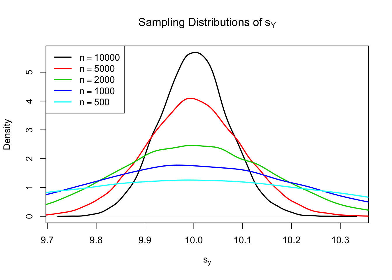 The plot shows that the distribution of \(s_Y\) tightens around the true value \(\sigma_Y = 10\) as \(n\) increases.