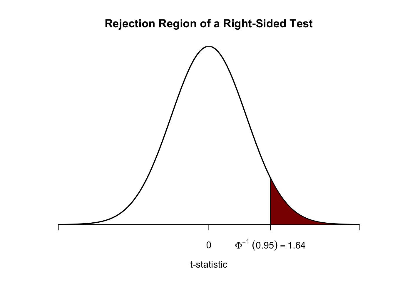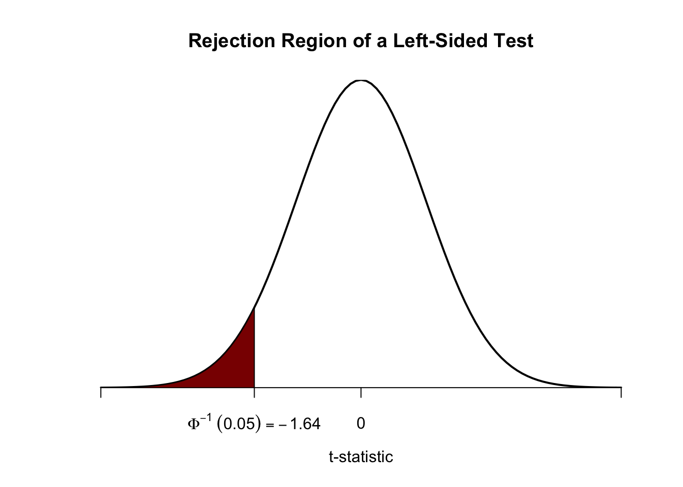 Analogously, for the left-sided test we have \[H_0: \mu_Y = \mu_{Y,0} \ \ \text{vs.} \ \ H_1: \mu_Y < \mu_{Y,0}.\] The null is rejected if the observed test statistic falls short of the critical value which, for a test at the \(0.05\) level of significance, is given by \(-1.64\), the \(0.05\)-quantile of the \(\mathcal{N}(0,1)\) distribution. \(5\%\) probability mass lies to the left of the critical value.