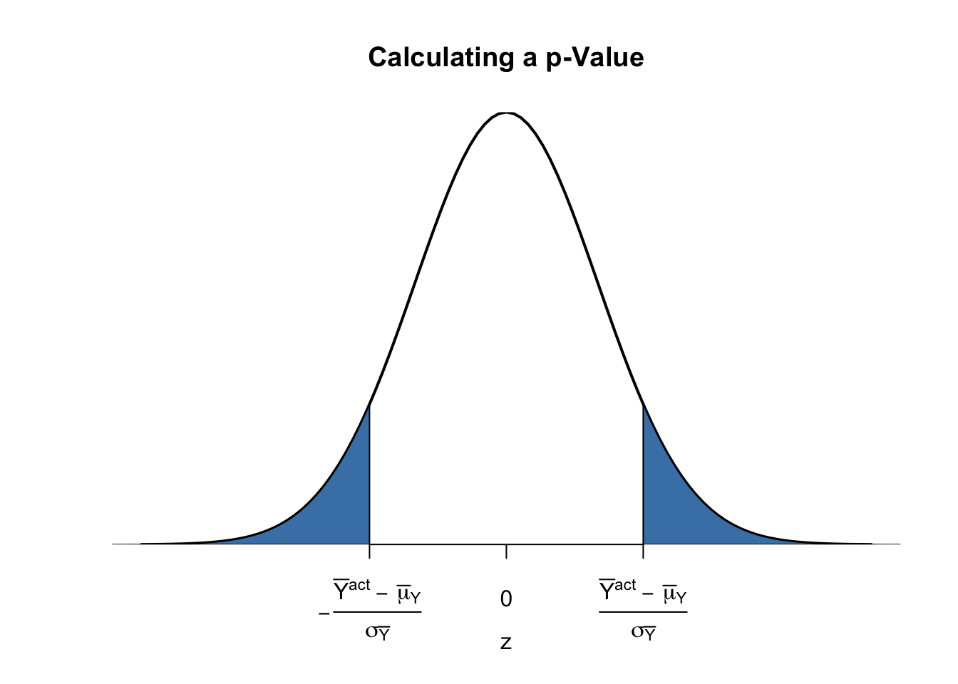 \[ p\text{-value} = 2\cdot\Phi\left(-\left\lvert \frac{\overline{Y}^{act}-\mu_{Y,0}}{SE(\overline{Y})} \right\rvert \right). \]
