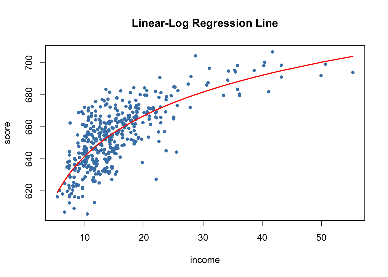 The estimated model states that for an income increase from \(\$10000\) to \(\$11000\), test scores increase by an expected amount of \(3.47\) points. When income increases from \(\$40000\) to \(\$41000\), the expected increase in test scores is only about \(0.90\) points.