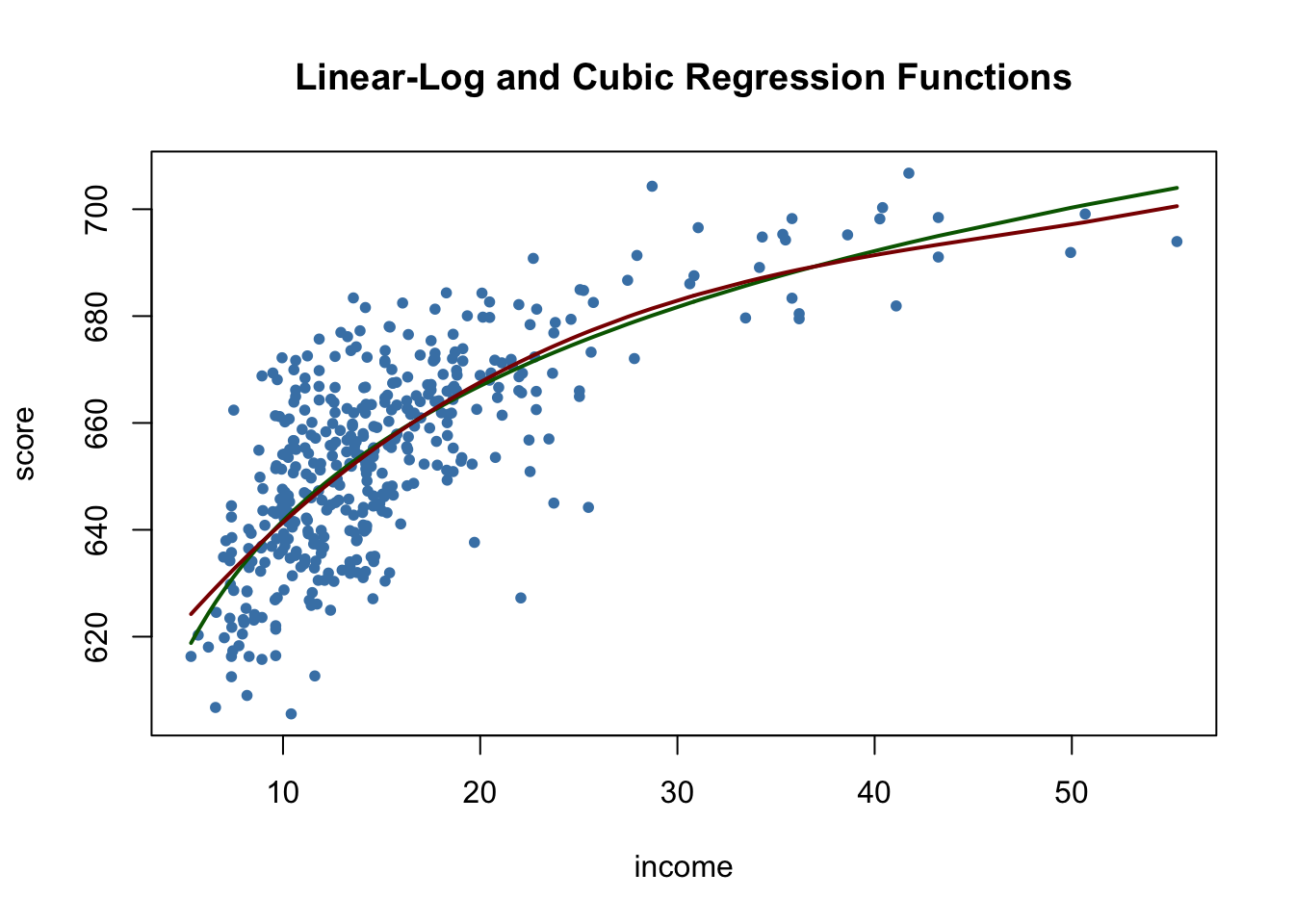 \[ TestScore_i = \beta_0 + \beta_1 \times \ln(income_i) + \beta_2 \times \ln(income_i)^2 + \beta_3 \times \ln(income_i)^3 + u_i \]