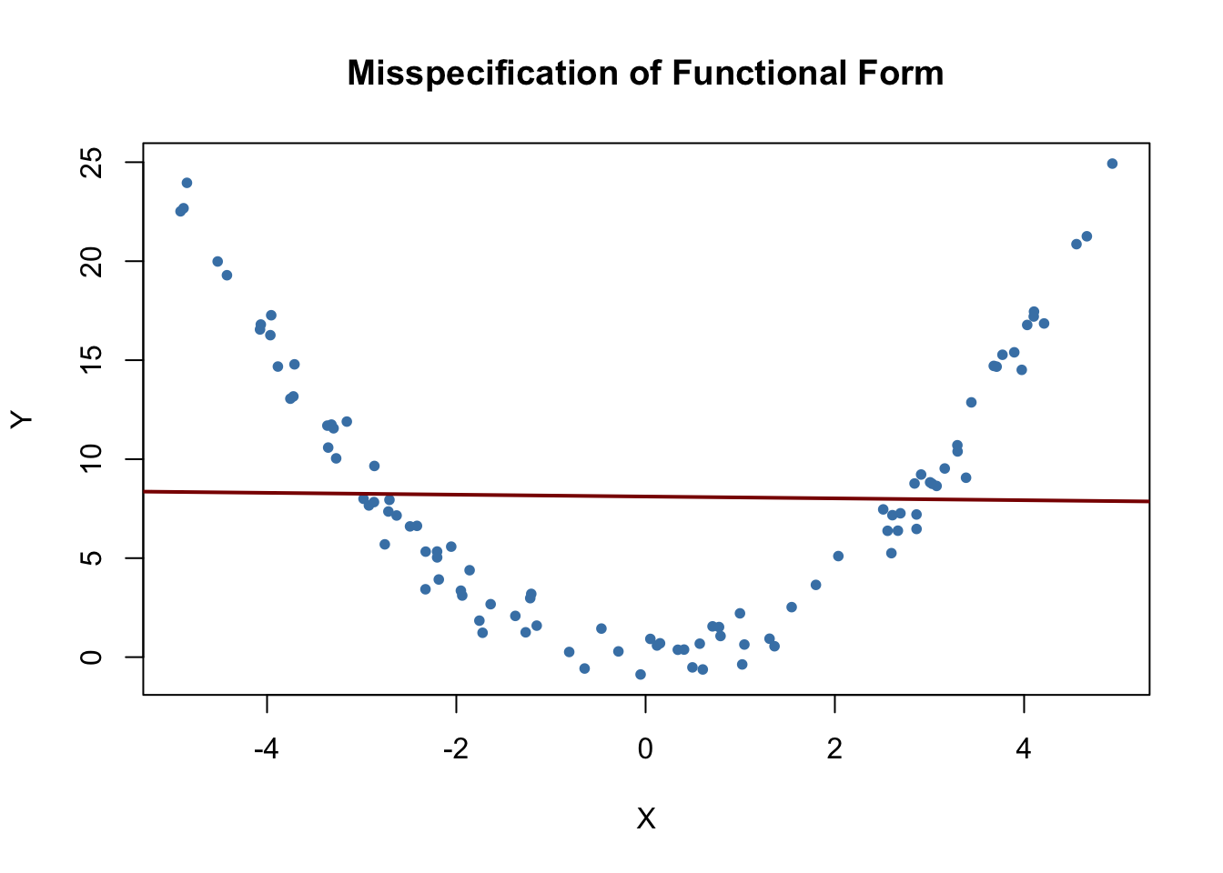 It is easy to come up with examples of misspecification of the functional form: consider the case where the population regression function is \[Y_i = X_i^2\] but the model used is \[Y_i = \beta_0 + \beta_1 X_i + u_i.\] Clearly, the regression function is misspecified here. We now simulate data and visualize this.