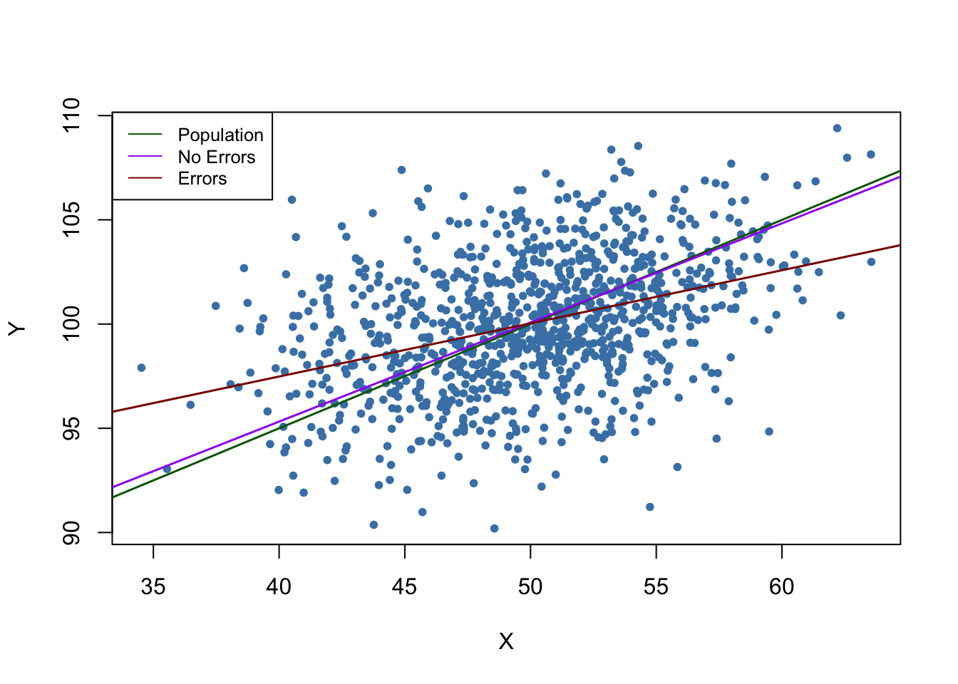For example, consider two bivariate normally distributed random variables \(X,Y\). It is a well known result that the conditional expectation function of \(Y\) given \(X\) has the form \[\begin{align} E(Y\vert X) = E(Y) + \rho_{X,Y} \frac{\sigma_{Y}}{\sigma_{X}}\left[X-E(X)\right]. \tag{9.2} \end{align}\] Thus for \[\begin{align} (X, Y) \sim \mathcal{N}\left[\begin{pmatrix}50\\ 100\end{pmatrix},\begin{pmatrix}10 & 5 \\ 5 & 10 \end{pmatrix}\right] \tag{9.3} \end{align}\] according to (9.2), the population regression function is \[\begin{align*} Y_i =& \, 100 + 0.5 (X_i - 50) \\ =& \, 75 + 0.5 X_i. \tag{9.4} \end{align*}\]Now suppose you gather data on \(X\) and \(Y\), but that you can only measure \(\overset{\sim}{X_i} = X_i + w_i\) with \(w_i \overset{i.i.d.}{\sim} \mathcal{N}(0,10)\). Since the \(w_i\) are independent of the \(X_i\), there is no correlation between the \(X_i\) and the \(w_i\) so that we have a case of the classical measurement error model. We now illustrate this example in R using the package mvtnorm (Genz, Bretz, Miwa, Mi, & Hothorn, 2018).