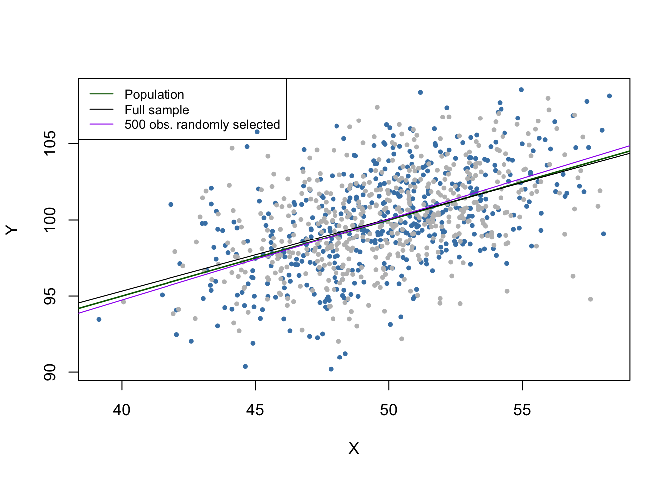 legend = c("Population", "Full sample", "500 obs. randomly selected"))
