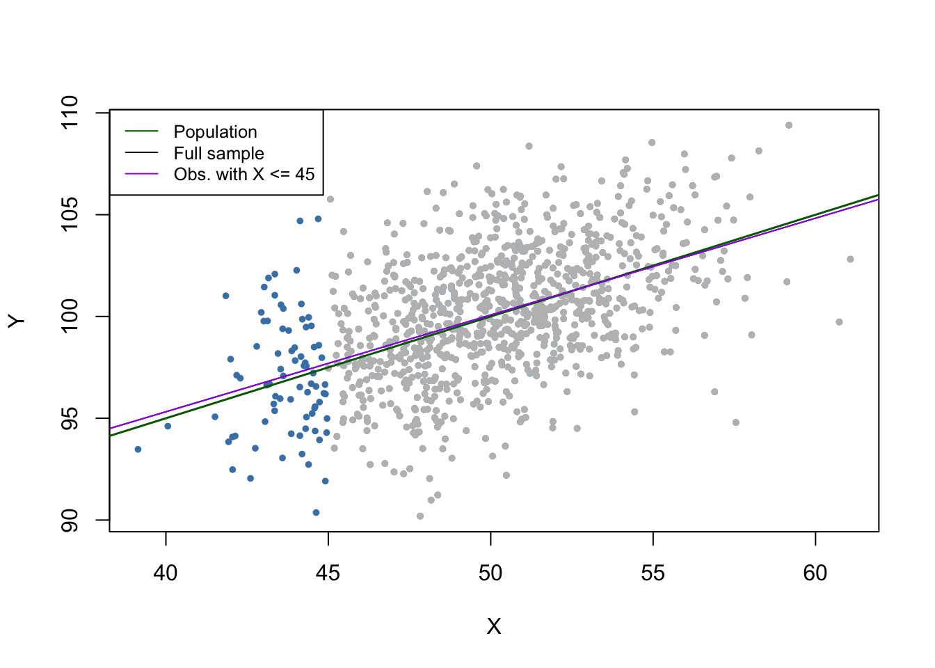 legend = c("Population", "Full sample", "Obs. with X <= 45"))