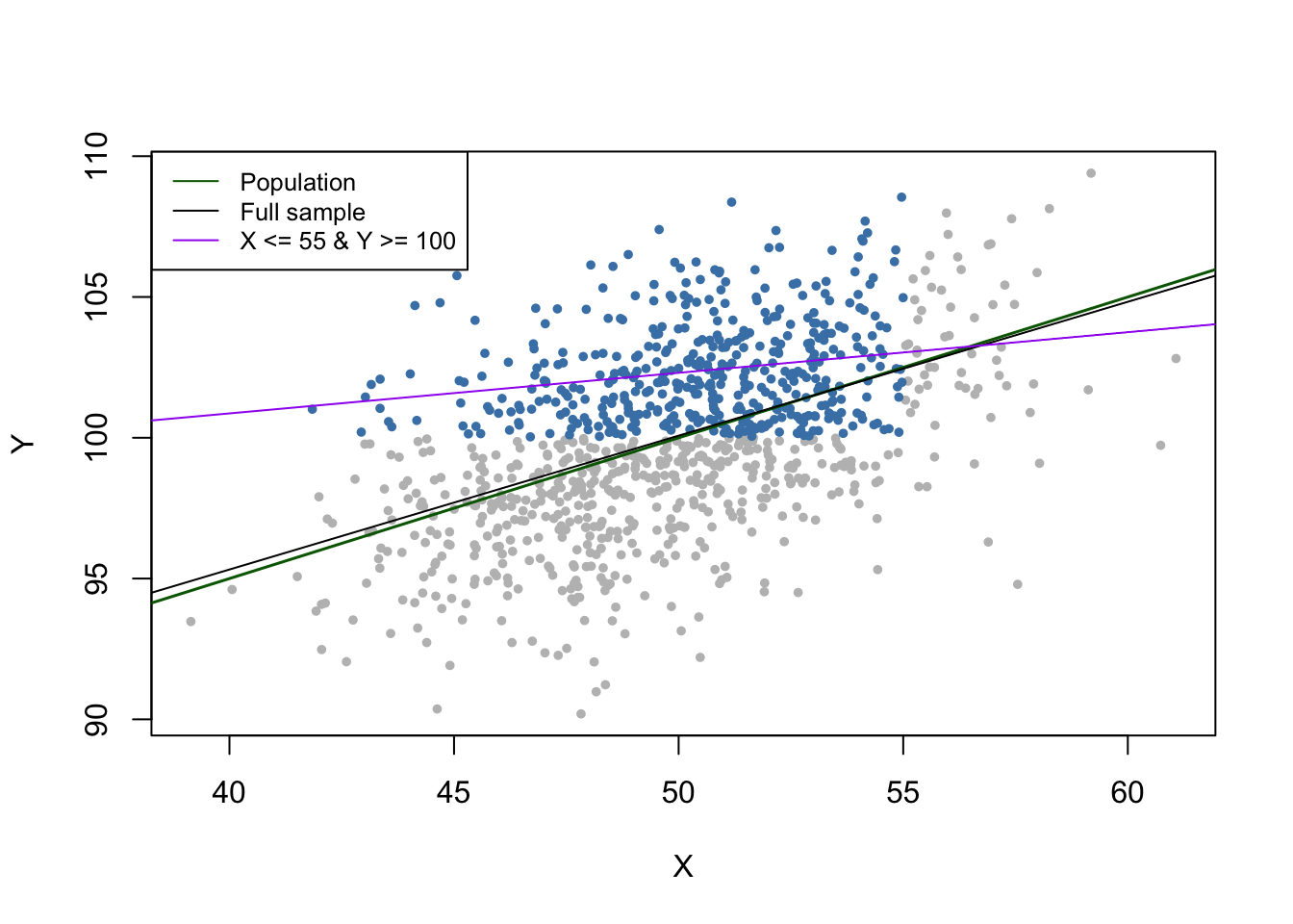 In the third case we face sample selection bias. We can illustrate this by using only observations with \(X_i<55\) and \(Y_i>100\). These observations are easily identified using the function which() and logical operators: which(dat$X < 55 & dat$Y > 100)