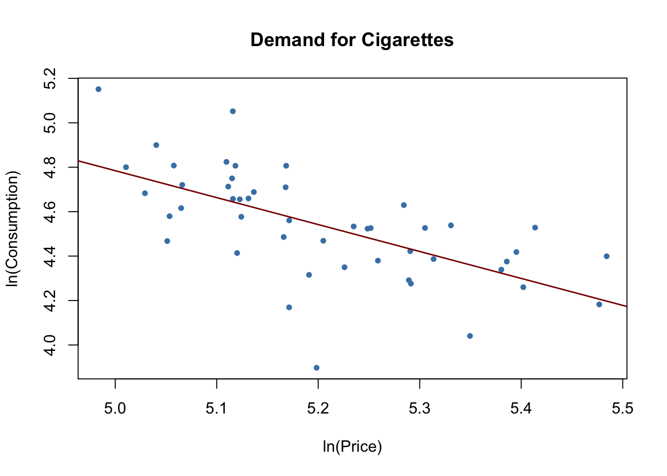 Remember from Chapter 8 that, due to the log-log specification, in the population regression the coefficient on the logarithm of price is interpreted as the price elasticity of consumption. The estimated coefficient suggests that a \(1\%\) increase in cigarettes prices reduces cigarette consumption by about \(1.2\%\), on average. Have we estimated a demand curve? The answer is no: this is a classic example of simultaneous causality, see Key Concept 9.6. The observations are market equilibria which are determined by both changes in supply and changes in demand. Therefore the price is correlated with the error term and the OLS estimator is biased. We can neither estimate a demand nor a supply curve consistently using this approach.