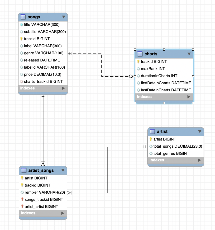 songs: stores information about songs.artist: stores information about artists.artist_songs: stores which songs are produced by which artists.charts: stores the maximum (highest) rank that a song achieves in the charts (the hypothetical marketplace has top-selling charts).