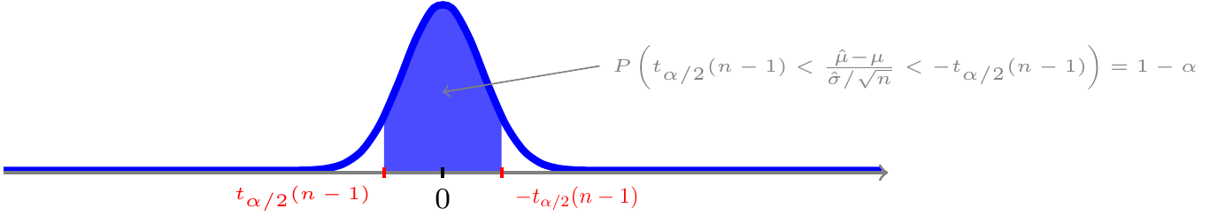 Mere formelt, så laver vi følgende overvejelse. For \(0<\alpha<1\) ligger \(\frac{\hat\mu-\mu}{\hat\sigma/\sqrt{n}}\) med sandsynlighed \(1-\alpha\) i intervallet \(\bigl[t_{\alpha/2}(n-1);\;\;-t_{\alpha/2}(n-1)\bigr]\)