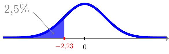 og pga. symmetrien også 2,5% sandsynlighed til højre for værdien 2,23