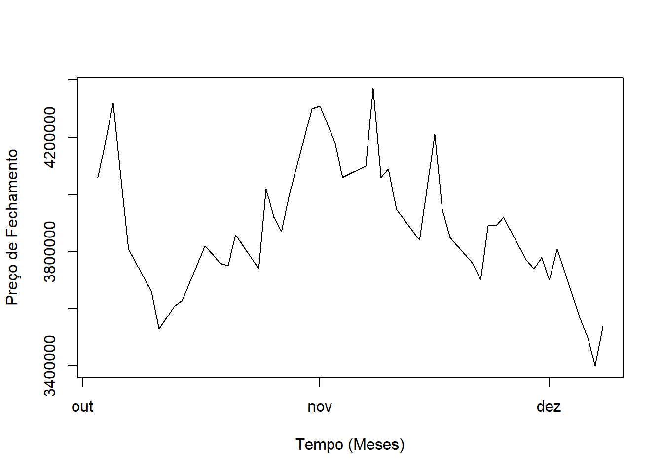plot(Ser ~ Data, type = "l", xlab = "Tempo (Meses)", ylab = "Preço de Fechamento")