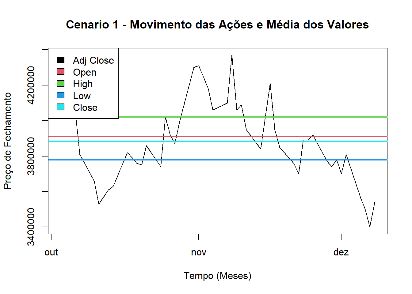 plot(Ser ~ Data, type = "l", xlab = "Tempo (Meses)", ylab = "Preço de Fechamento", main= "Cenario 1 - Movimento das Ações e Média dos Valores")