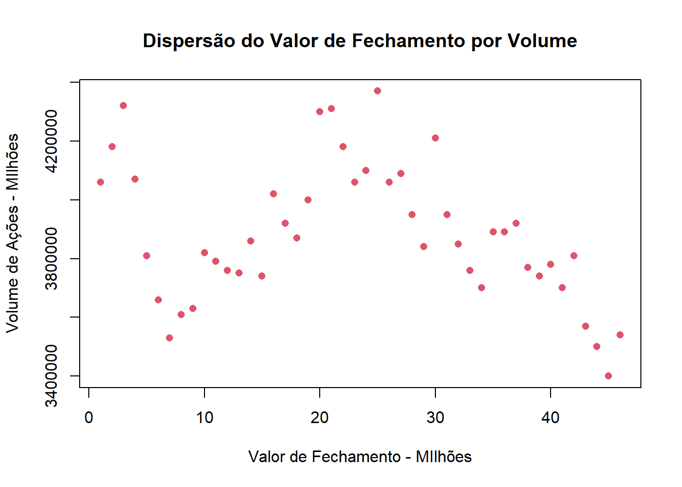 plot(subConjunto$Close, subConjunto$subConjunto$Volume, col = 2, pch = 16, xlab = "Valor de Fechamento - MIlhões", ylab = "Volume de Ações - MIlhões", main="Dispersão do Valor de Fechamento por Volume")## Warning: Unknown or uninitialised column: `subConjunto`.