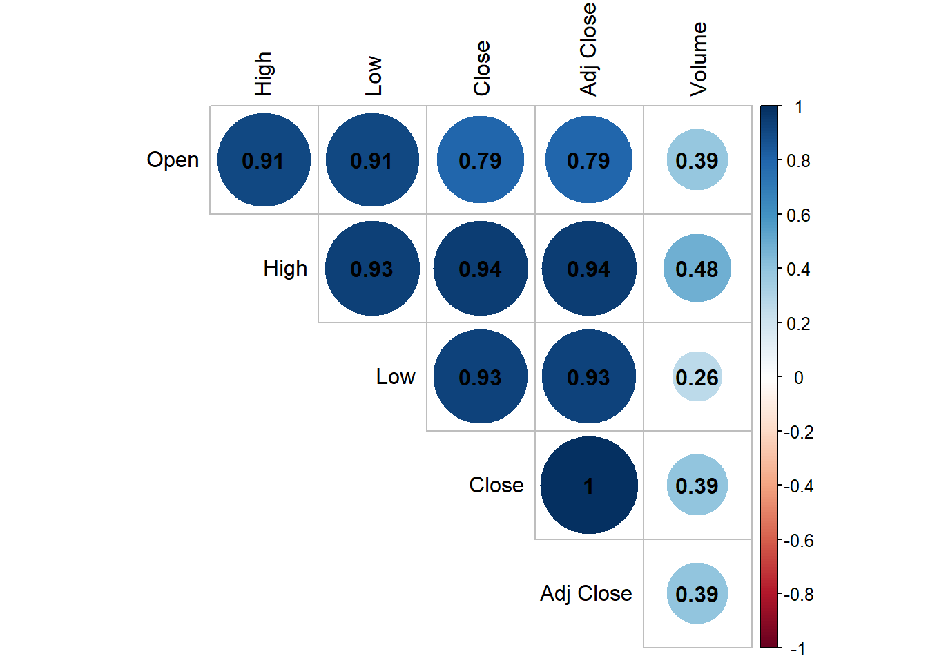 corrplot(cor(dataTemp %>% select(2:7)),method = "circle", type="upper", diag=FALSE,addCoef.col="black",tl.col="black")