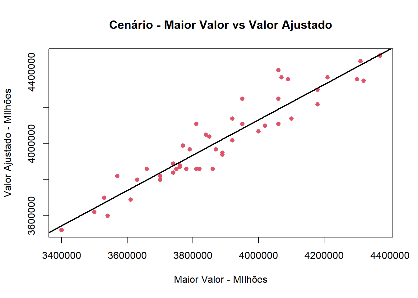 plot(dataTemp$High ~ dataTemp$`Adj Close`, col = 2, pch = 16, xlab = "Maior Valor - MIlhões", ylab = "Valor Ajustado - MIlhões", main = "Cenário - Maior Valor vs Valor Ajustado")