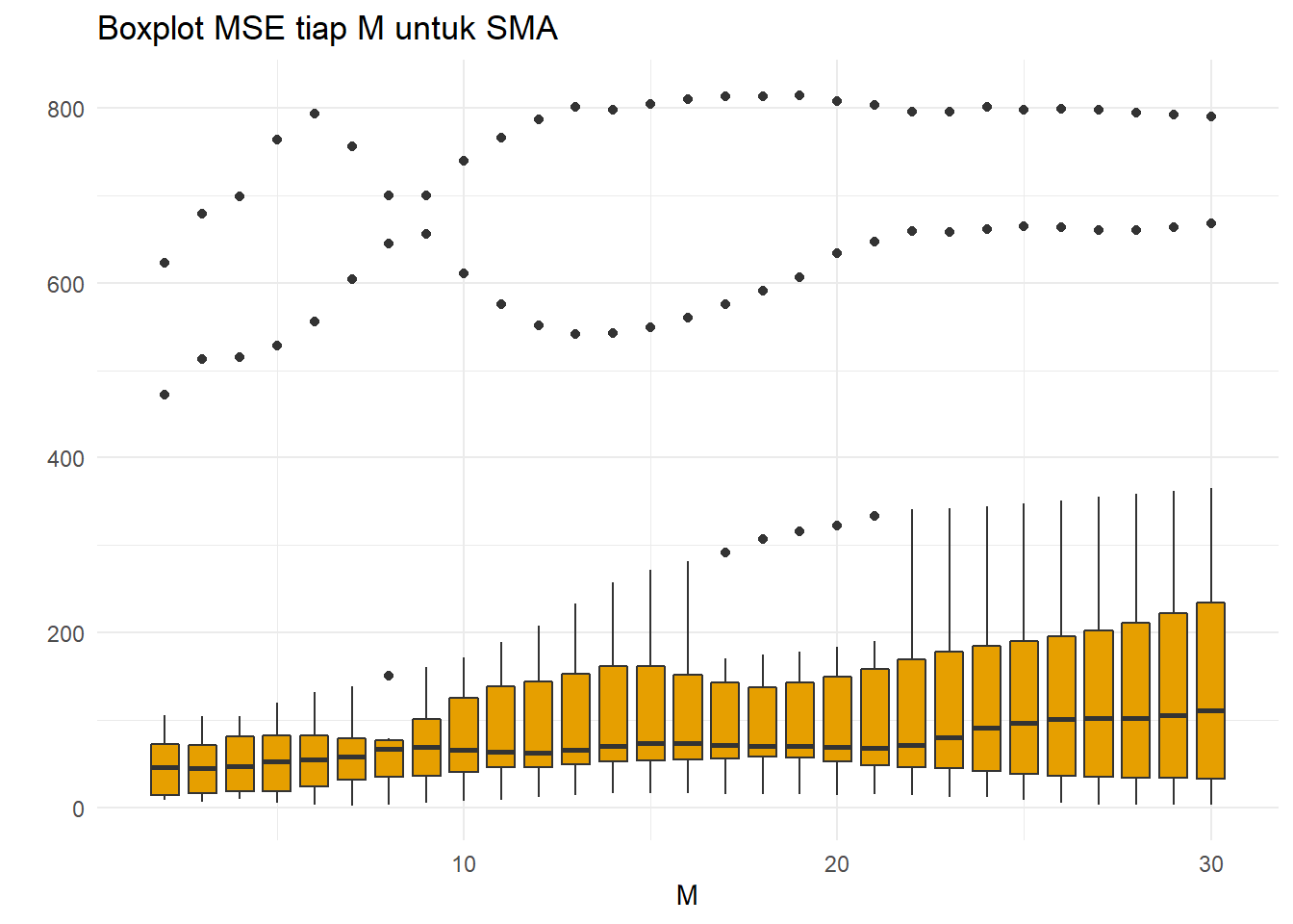 varMAE=var(MAE)), by=list(M)]Jika dilihat nilai M yang meminimumkan mean dari MSE, MAPE, dan MAE: