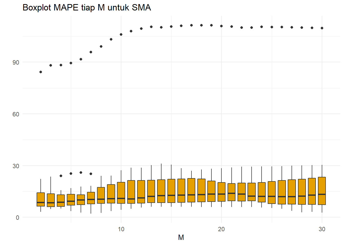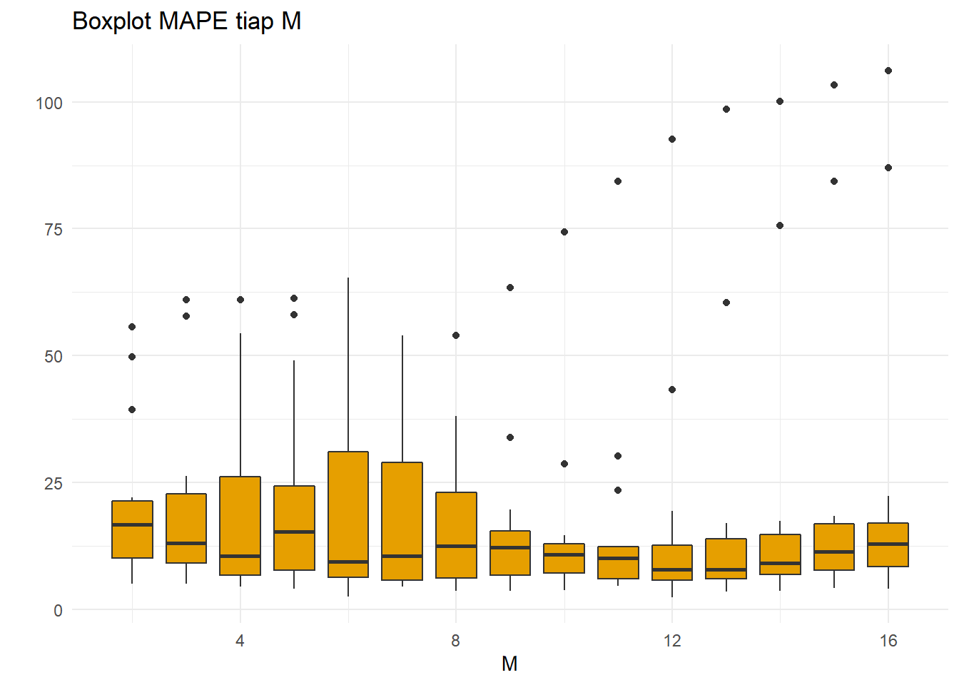 Dapat dilihat bahwa median MSE cenderung sama di tiap nilai parameter M. Setelah melewati \(M=20\), median baru terlihat naik. Namun, keragaman dari boxplot cenderung terus meningkat jika nilai parameter bertambah. Hampir semua boxplot memiliki pencilan. Bagaimana dengan MAPE?